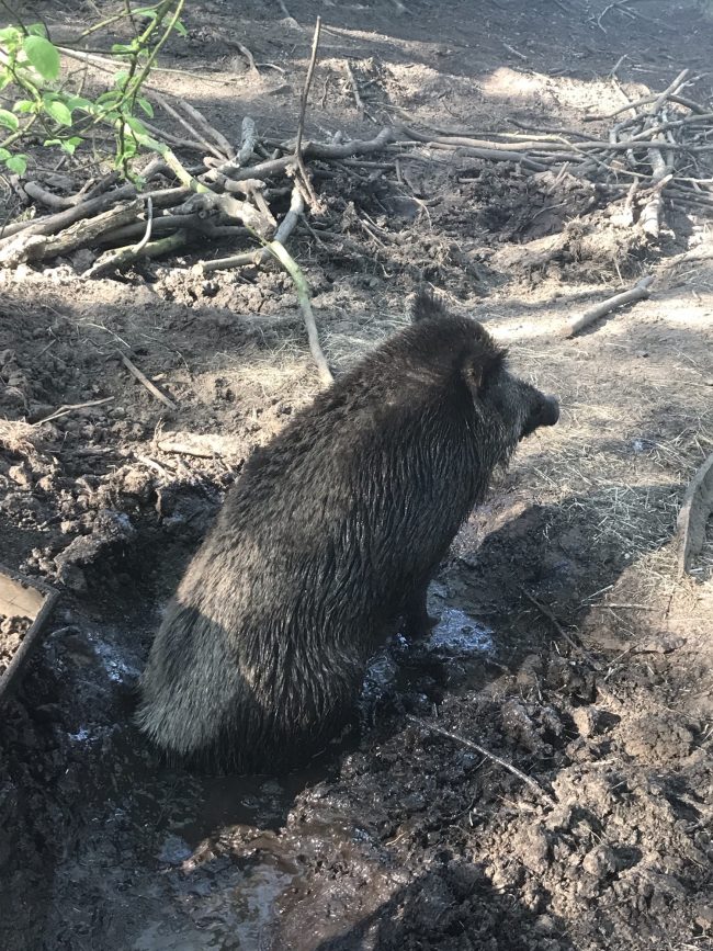 Anton nimmt ein Schlammbad in der Suhle und genießt es bei dem schönen Wetter