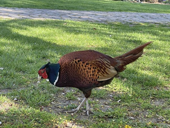 Einer der im letzten Jahr ausgewilderten Fasanen besucht uns täglich auf dem Hof